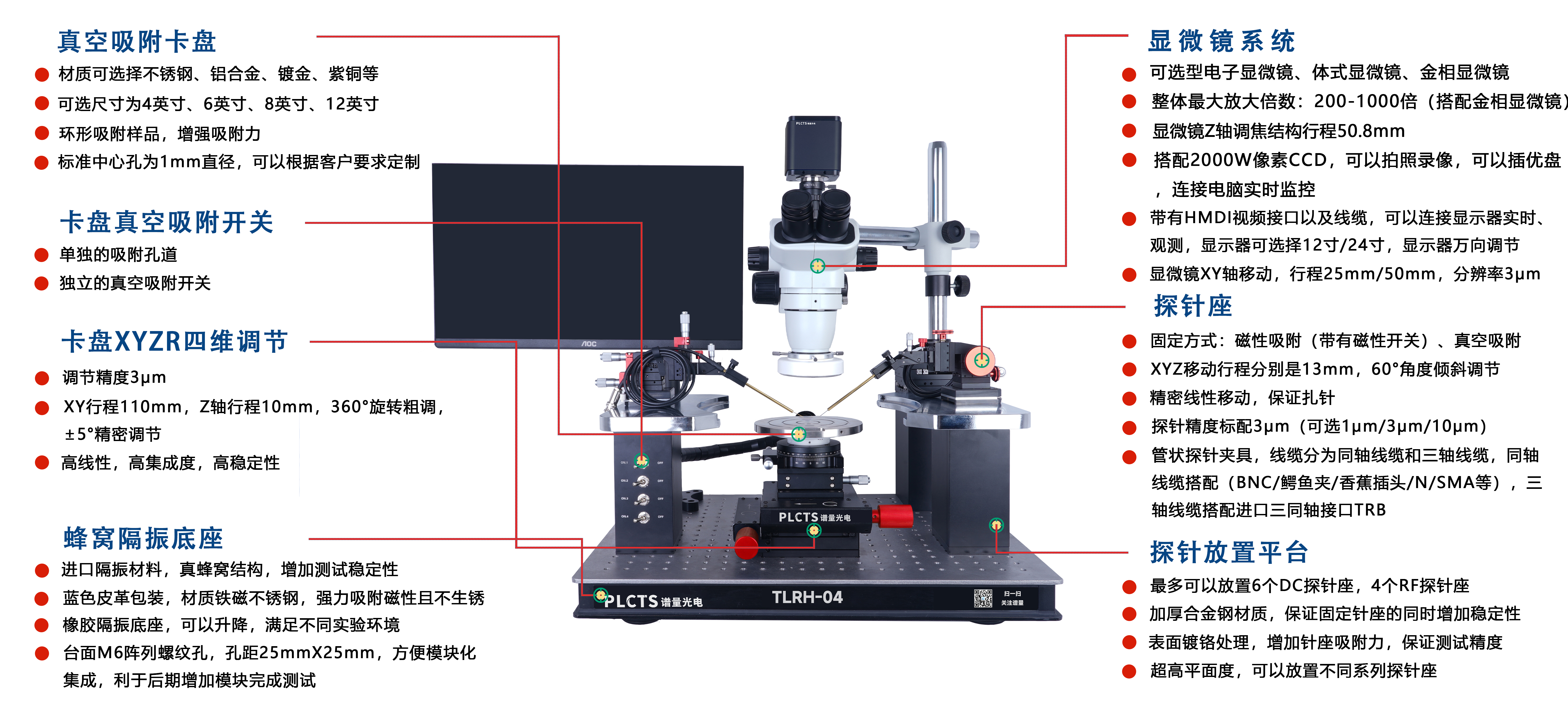 PLCTS 精密型基礎(chǔ)測試探針臺整體結(jié)構(gòu)緊湊,一體化集成設(shè)計,底部設(shè)計面包板結(jié)構(gòu)具體很高的測試穩(wěn)定性。漏電精度可達(dá)100fA(屏蔽箱內(nèi)),綜合最大放大倍數(shù)~270倍,如需更換探針座款式(1μm、0.7μm等)及線纜規(guī)格(同軸線纜)可聯(lián)系客服。