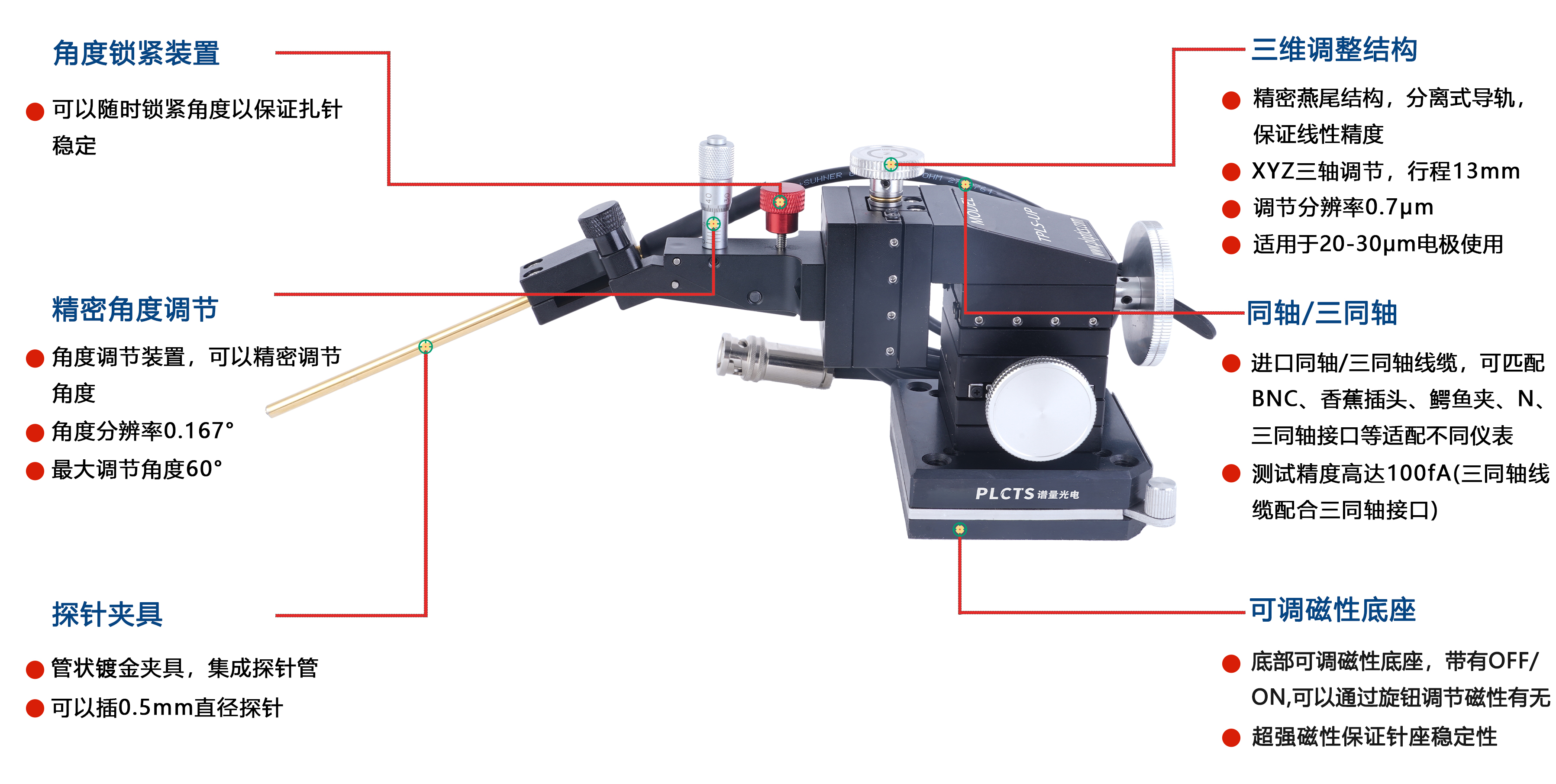 譜量光電 通用型0.7μm探針座整體采用航空鋁合金,表面噴砂氧化,具有很好的耐腐蝕能力。位移采用精密燕尾式交叉滾珠導(dǎo)軌,保證線性精度。主要用途探針與待測(cè)器件(如芯片)接觸,傳輸測(cè)試信號(hào)并收集響應(yīng)信號(hào),以評(píng)估待測(cè)器件的性能和質(zhì)量,為半導(dǎo)體芯片的電參數(shù)測(cè)試提供一個(gè)導(dǎo)通條件。根據(jù)客戶應(yīng)用電極大小和測(cè)試精度不同,還有10μm、3μm、1μm、0.5μm等款式供客戶選擇;廣泛應(yīng)用于半導(dǎo)體晶圓測(cè)試、芯片器件研發(fā)與制造、納米材料測(cè)試等,如有定制化標(biāo)準(zhǔn)(行程、精度、夾具等)可聯(lián)系客戶咨詢。
