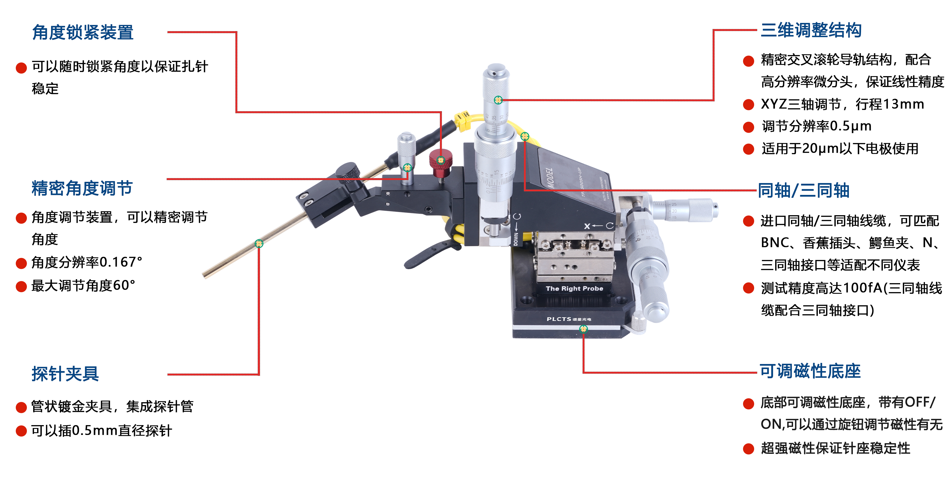 PLCTS 通用型0.5μm探針座采用鋁合金材質(zhì),表面噴砂氧化,具有良好的機(jī)械性能。位移采用不銹鋼交叉滾珠導(dǎo)軌,超高穩(wěn)定性,適用于20μm以下電極使用。廣泛應(yīng)用于晶圓芯片、半導(dǎo)體光電元件、納米材料等光電測(cè)試。