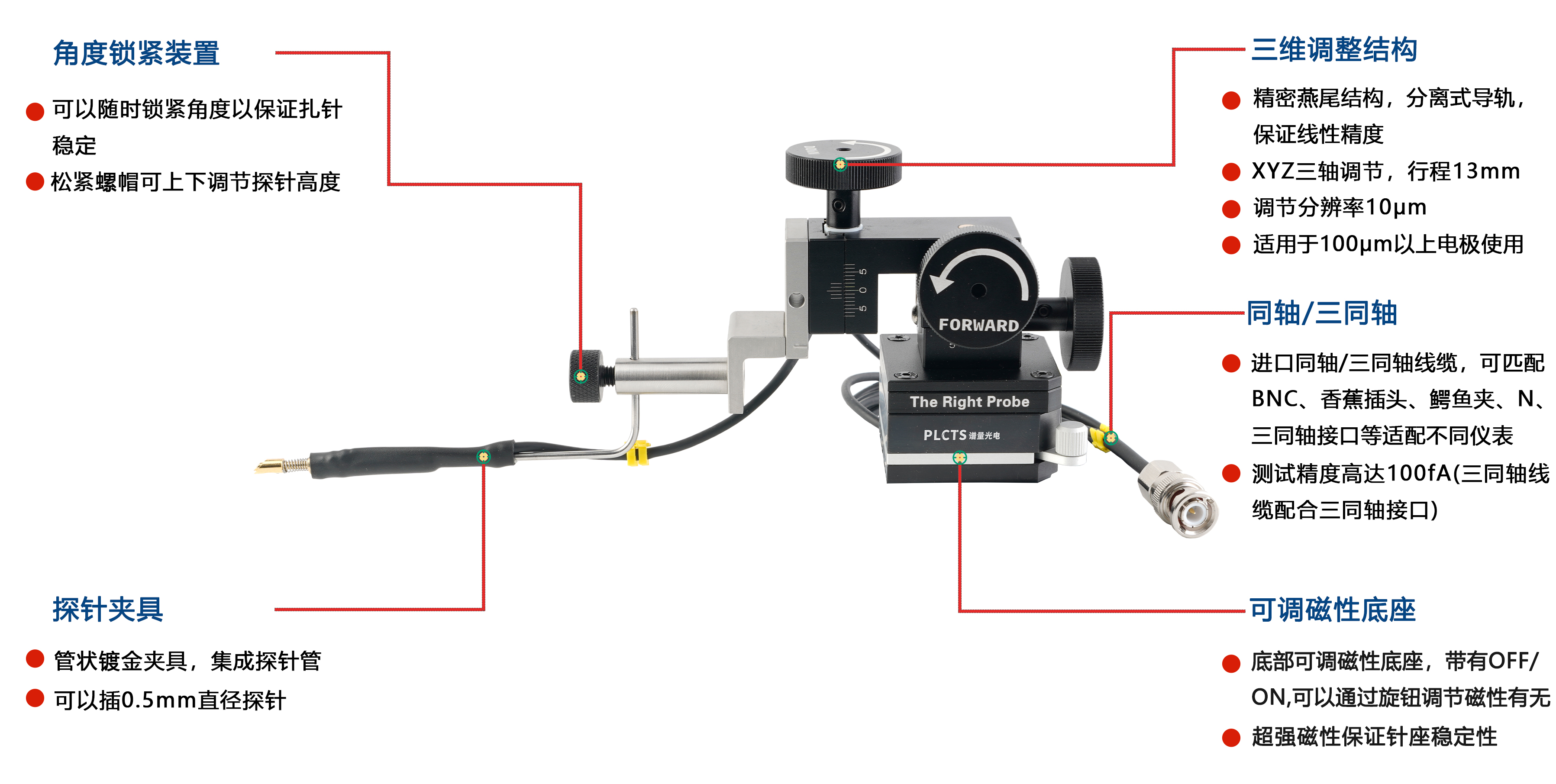 PLCTS 10μm調(diào)節(jié)精度L型探針座適用于100μm以上電極使用,適用于直流I-V測試,C-V測試,I/O點(diǎn)測試等。廣泛應(yīng)用于晶圓芯片、半導(dǎo)體材料器件、太陽能電池、集成電路等相關(guān)行業(yè)領(lǐng)域。