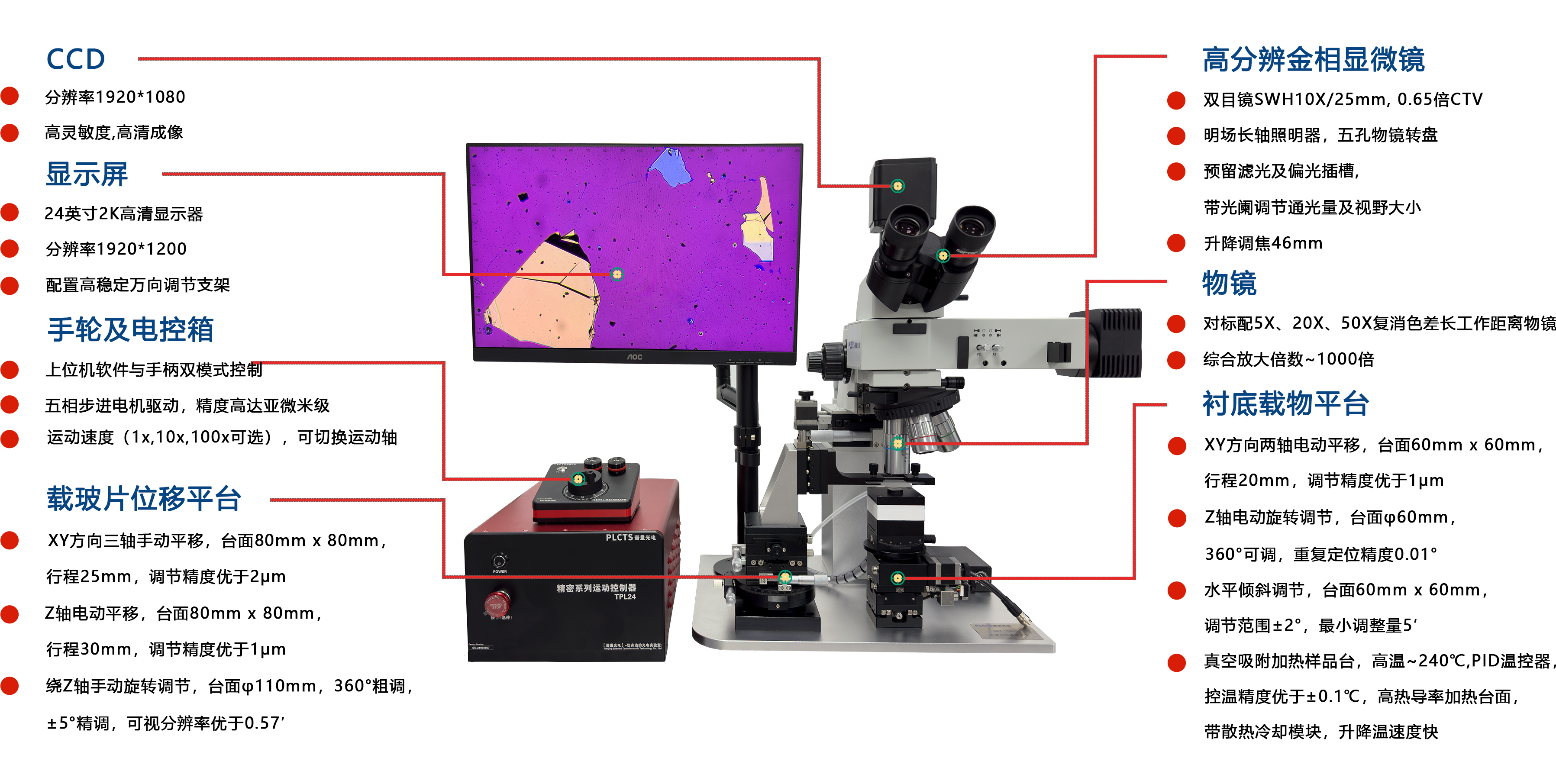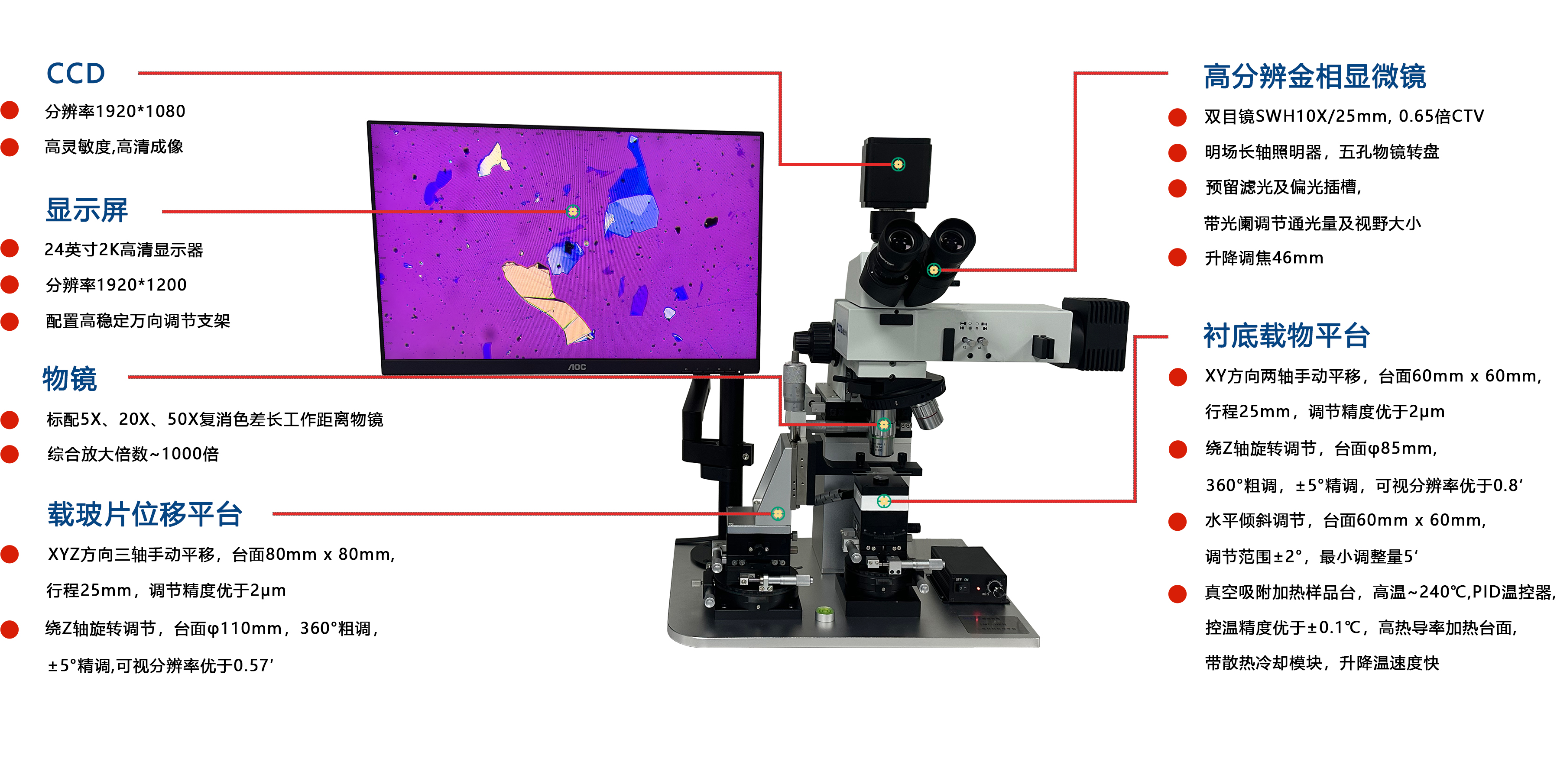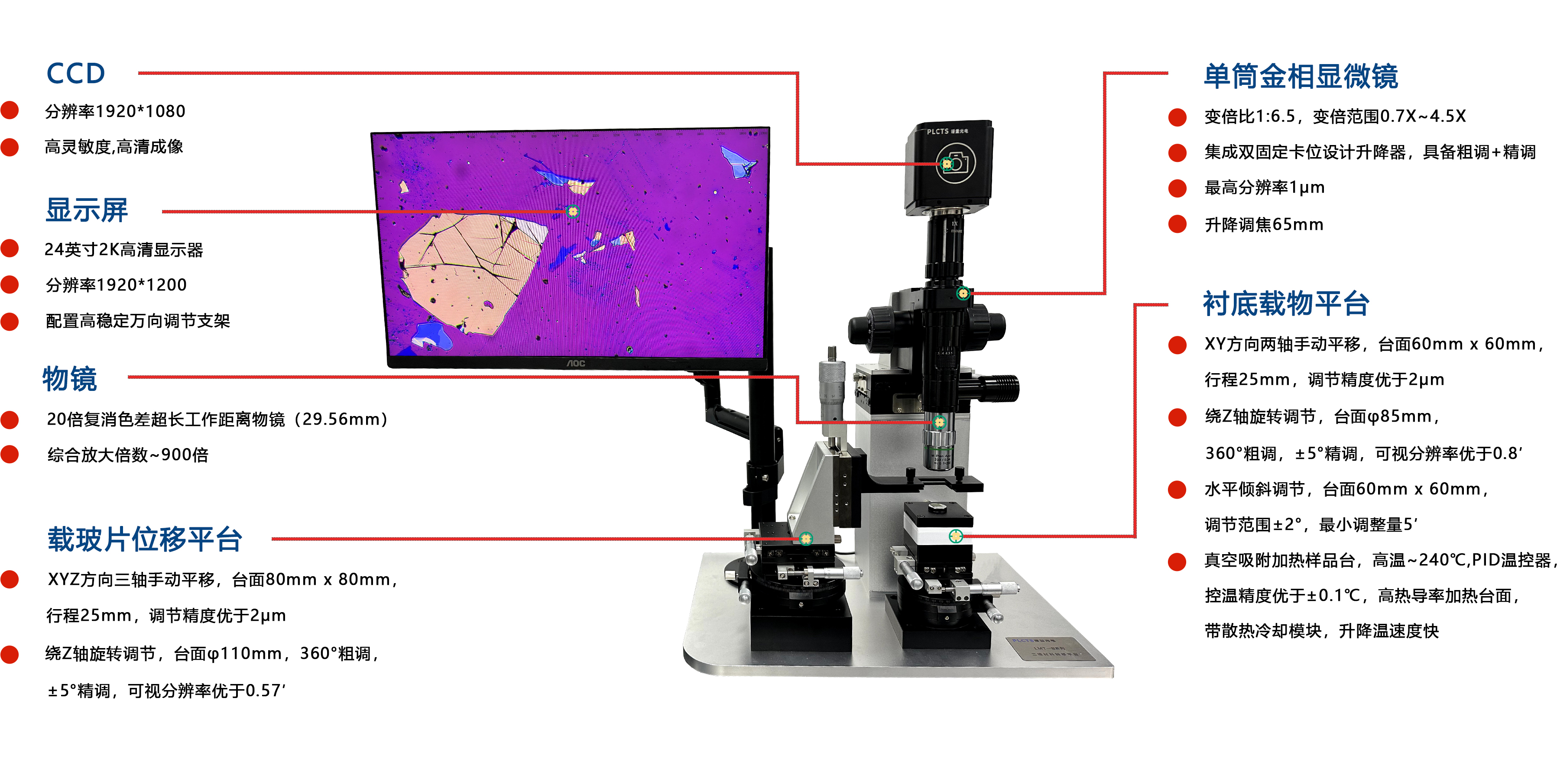 PLCTS 精密型二維材料轉(zhuǎn)移平臺搭配單筒顯微鏡,變倍比1:6.5,變倍范圍0.7X-4.5X,綜合放大倍數(shù)~900倍。使用PID溫度控制器,控溫精度優(yōu)于±0.1℃提高材料轉(zhuǎn)移的穩(wěn)定性。還配有風(fēng)冷散熱模塊,大大的提高整體實(shí)驗(yàn)轉(zhuǎn)移的效率。主要實(shí)現(xiàn)低維材料(如石墨烯、過渡金屬硫化物、黑磷等)的精確轉(zhuǎn)移和定位的作用。