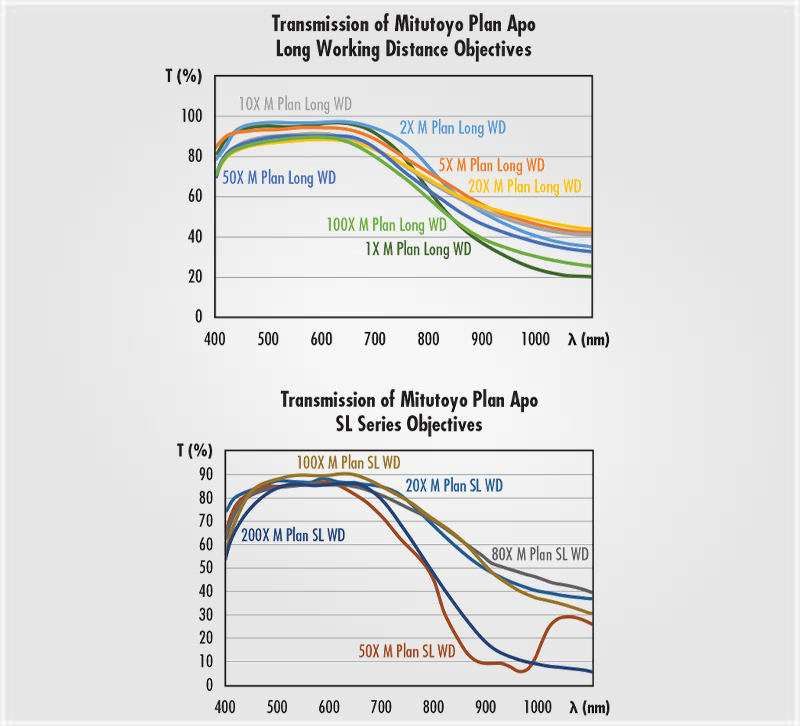 PLCTS 提供 Mitutoyo長工作距離平場復消色差物鏡。可以對紅、藍、黃三色進行色差校正,并且針對明場照明(入射照明平行于光軸)進行了優(yōu)化,是明場照明應用的理想之選。物鏡鏡頭均有平場復消色差設計,以保持盡可能高的NA和對比度。 HR 系列提高了數值孔徑,使得分辨率更高;而SL系列則是提高了物鏡的工作距離,使得得到更長的工作距離成像,適應更多成像環(huán)境。