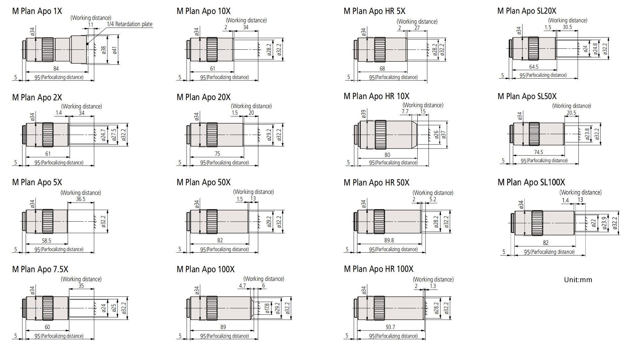 譜量光電提供Mitutoyo超長工作距離的平場復消色差物鏡。此系列物鏡解決了工作距離和光學參數的矛盾,避免使用過時的同行仍在使用的方法;設計一個更大更長的顯微物鏡(95mm齊焦)使得設計簡單化,實現高倍率的自由觀察和獨立的色差補正,以保持盡可能高的NA和對比度。復消色差物鏡可以對紅、藍、黃三色進行色差校正,而一個普通的消色差物鏡只能對紅、藍二色進行校正。并且針對明場照明(入射照明平行于光軸)進行了優(yōu)化,是明場照明應用的理想之選。無窮遠校正系統(tǒng)需要一個筒透鏡。所有標注的放大倍率均基于200mm的筒透鏡焦距。適用于波長范圍436nm - 656nm使用,物鏡安裝螺紋為M26×0.706。