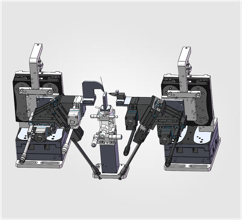 PLCTS 半自動波導耦合平臺將兩側(cè)六軸調(diào)節(jié)臺XYZ軸升級為電動,電機類型采用五相步進電機,提高了耦合精準度和效率。耦合過程:在光纖與芯片大致對準后,打開光源,使光源從光纖射入芯片。使用功率計檢測從芯片輸出端射出的光功率。然后使用軟件自動搜光和爬山功能;當光功率達到最佳時,說明輸入端光纖與芯片已經(jīng)實現(xiàn)了最佳對準,然后將輸出端的功率計檢測置換成需要的光纖。同理,右側(cè)進行爬山自動搜光,當功率計檢測數(shù)值最接近剛剛檢測的最佳值時,說明光纖基本與芯片耦合對準完成。