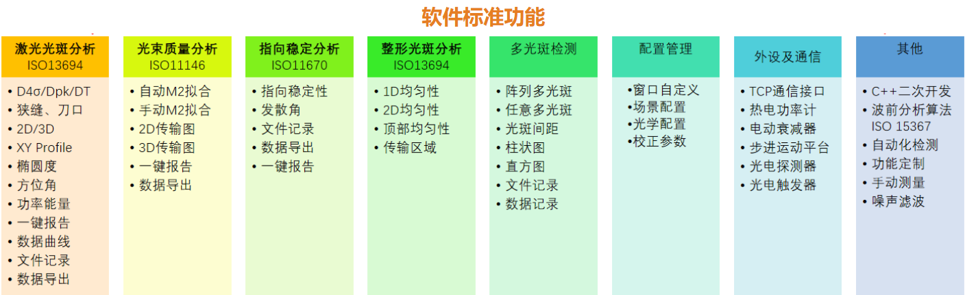 PLCTS 可見光款光束質量分析儀設計結構緊湊,標配支架,衰減,使用方便;波長測量范圍190-1350nm可選,光斑測量范圍覆蓋22μm-22mm具有9款不同范圍可選。支持激光器最大光功率測量1W,并且兼容脈沖和連續(xù)激光測量。光學接口采用標準C-Mount/M58×0.75,可便于選加額外衰減片組裝。專用于激光腔鏡調整、外光路準直、光纖對準耦合分析等。