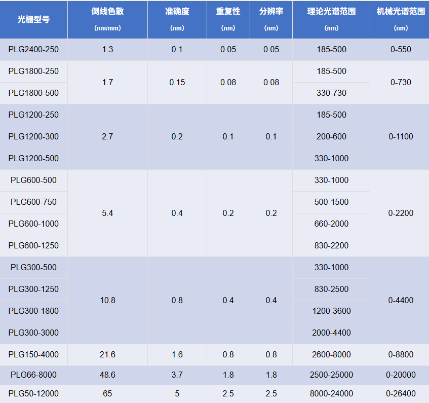 例如:光柵的刻線數(shù)為1200g/mm,閃耀波長(zhǎng)300nm,該光柵的型號(hào)為PLG1200-300