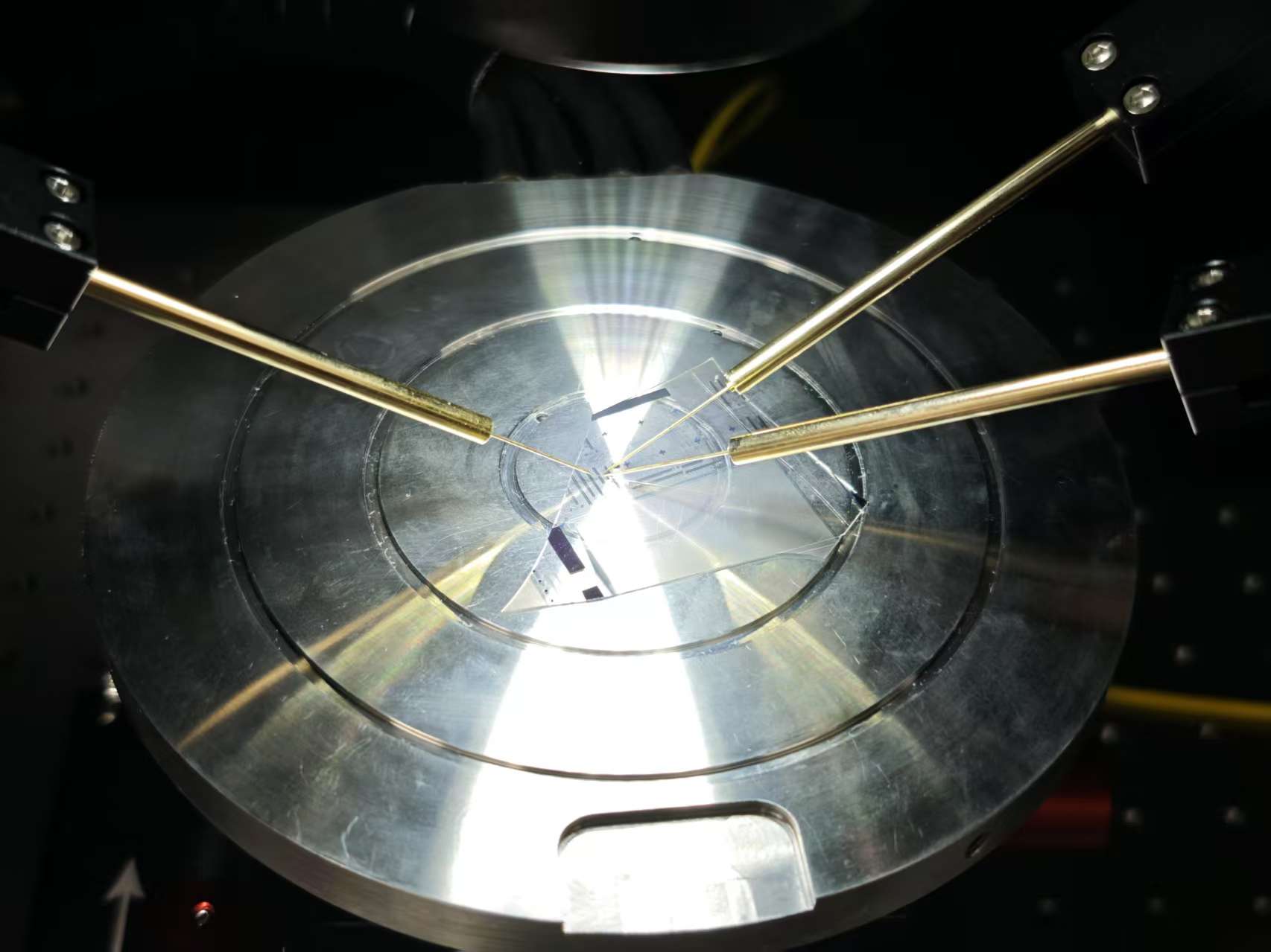 探針移動(dòng):通過探針座上的X-Y-Z三向微調(diào)旋鈕,將探針緩慢移動(dòng)至接近待測點(diǎn)。