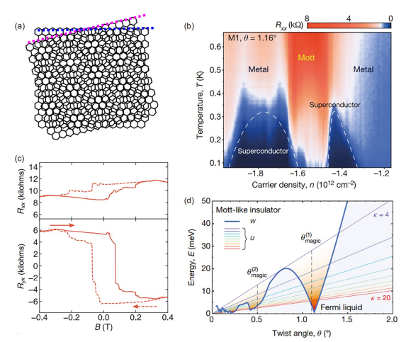 如果以特定扭轉(zhuǎn)角(1.1°)進(jìn)行單層石墨烯的堆疊,此時(shí)則會(huì)形成魔角石墨烯,這是近年來研究最為廣泛的莫爾超晶格材料,有許多新奇的物理特性。
