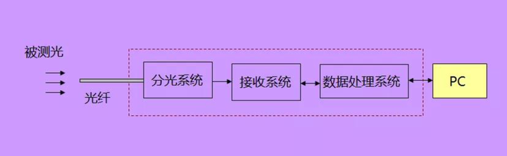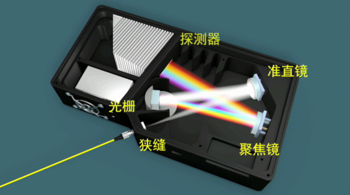 光纖通過 SMA 905或者FC接口,把光子引入到光譜儀內(nèi)部,然后通過狹縫成像之后到達準(zhǔn)直鏡,對光路進行準(zhǔn)直,之后到達光柵部分做分光。光柵主要是將光波四散成不同的光束,最終到達檢測器。然后,進行數(shù)據(jù)分析。