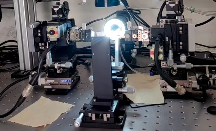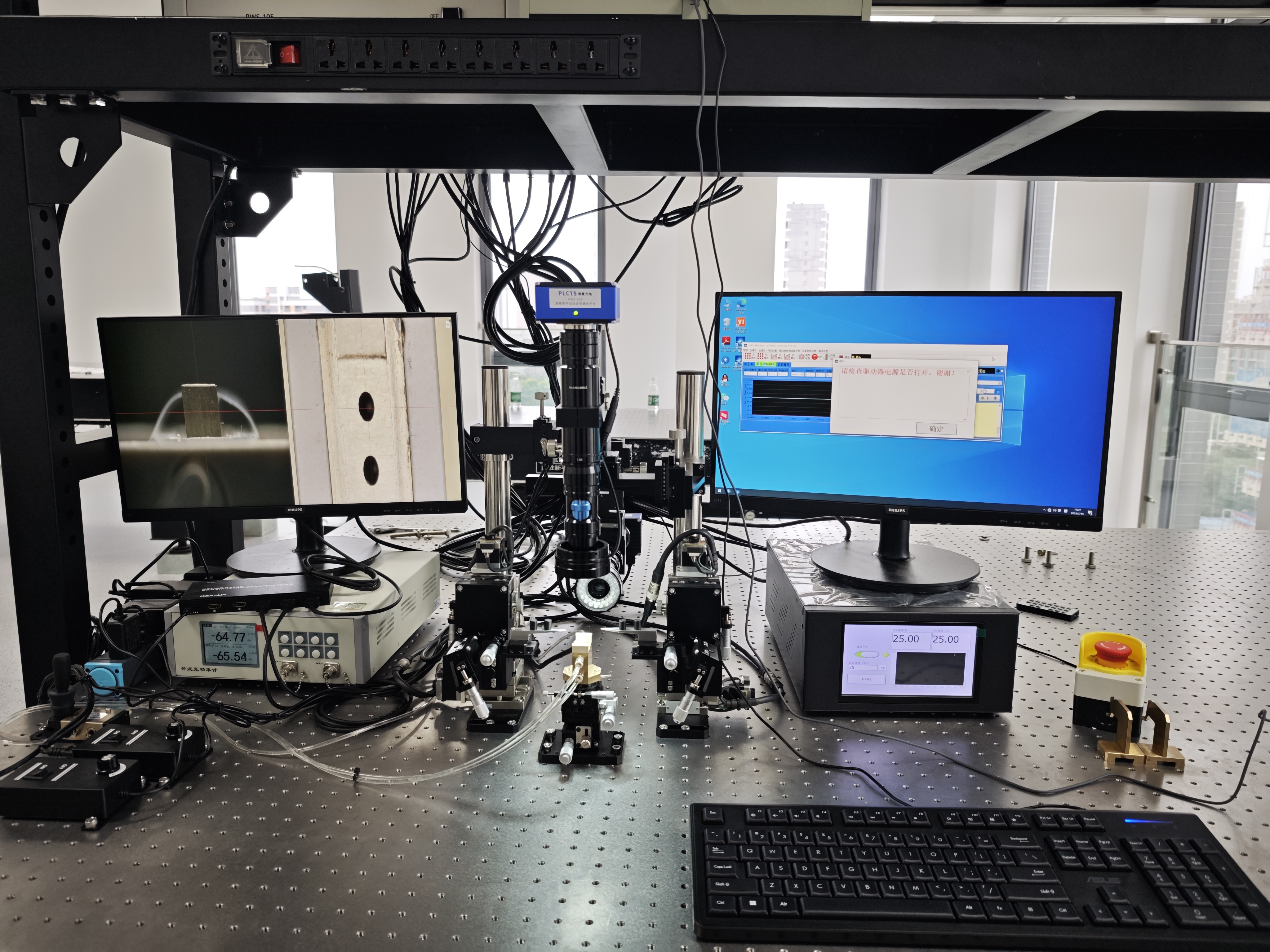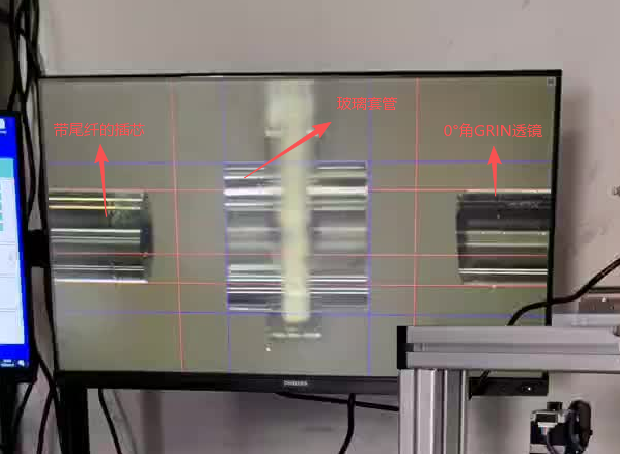 首先,需要一臺光波導(dǎo)耦合系統(tǒng),將帶尾纖的插芯與GRIN透鏡固定再2側(cè)的6維位移臺上,且用夾具夾持玻璃套管如下圖1顯示屏中所示。