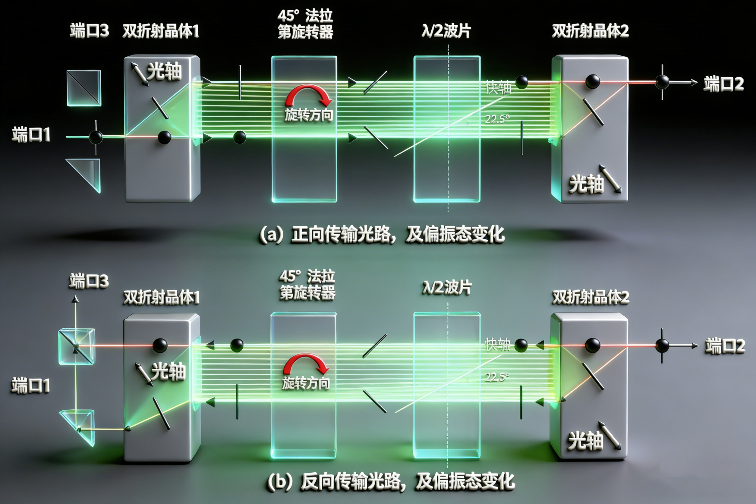 b、45° 法拉第旋轉(zhuǎn)器:基于磁光非互易性,使光的偏振面固定旋轉(zhuǎn) 45°(旋轉(zhuǎn)方向與光傳播方向無關(guān),是單向性的核心);